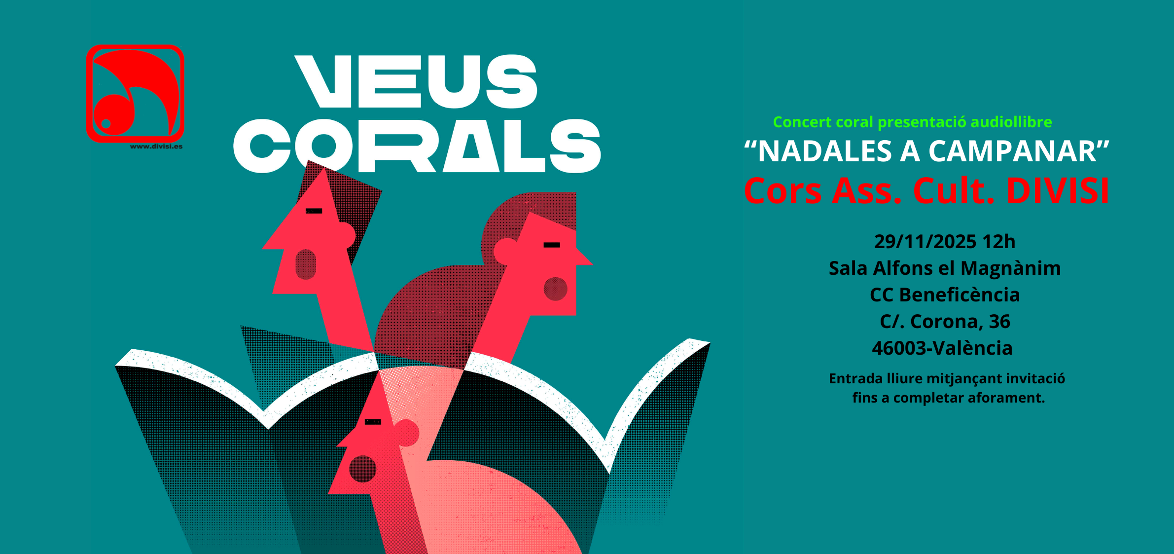 Aquest dissabte, a les 12h en la Sala Alfons el Magnànim del Centre Cultural La Beneficència tindrà lloc un concert coral, dins la campanya VEUS CORALS (Diputació de València) amb la participació del cors de l’Associació Cultural DIVISI (Xiquets Cantors DIVISI I Cor Cantart-DIVISI).
